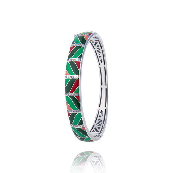 Ce bracelet vert pour femme en argent massif de la collection bracelets en argent pour femme, est un bracelet nature bijoux Una Storia en argent massif 925/1000e laqué par nos joailliers créateurs. Dès que vous le passez autour de votre poignet, ce bracelet femme vert interpelle immédiatement par son design graphique et coloré. Ce bracelet nature bijoux Una Storia est une interprétation moderne du thème végétal voulu moderne pour pouvoir être porté en toutes occasions. Le bracelet vert pour femme en argent massif Fougère reprend les tons de la fougère de nos sous-bois à chaque période de l’année. Les ramures stylisées sont assez géométriques et rehaussées par des barrettes en pierres d’oxydes de zirconium incrustées verticalement dans le bijou. Vous pouvez assortir ce bracelet vert pour femme en argent massif de la collection Fougère à une tenue vestimentaire hivernale assez chaude, mais aussi le porter à l’automne quand vous vous promenez dans la campagne lors de week-ends de détente. En été, mettez-le tout simplement à votre poignet pour faire ressortir votre bronzage estival grâce aux tons éclatants dont il est composé.