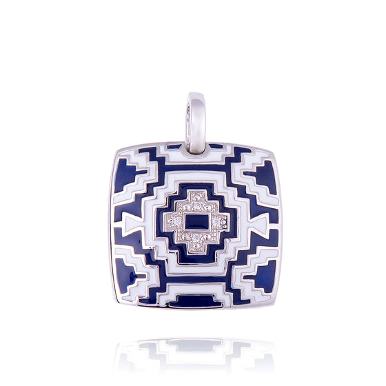 Le pendentif Aztec mexicain en argent 925 pour femme de notre collection pendentif en argent massif pour femme affiche ses formes géométriques. Une invitation au voyage en Amérique Centrale. Sa forme carrée et légèrement bombée, son imprimé graphique recouvert de couleur bleu proche de l'obsidienne, rappellent les diverses cultures d’Amérique Centrale et surtout celle des Aztèques. Associez ce ravissant pendentif bleu et blanc en argent 925 rhodié en forme de médaillon carré à une chaîne en argent rhodié, un cordon en coton huilé bleu marine ou un câble en argent vendus séparément sur notre site officiel. Cet ensemble vous permettra de faire l'acquisition d'un magnifique collier pour femme pouvant se porter avec différentes idées de tenues vestimentaires. Assortissez votre pendentif original à la bague mexicaine pour femme en argent Aztec. Un tailleur bleu marine, une longue robe blanche décolleté, un top bleu ou blanc à fines bretelles. Ce pendentif Aztec mexicain en argent 925 pour femme bleu, bijou iconique de notre joaillerie française Una Storia, fait partie de la parure de bijoux argent Aztèque femmes que vous pouvez découvrir afin de former une parure en argent sterling exceptionnelle. Assortissez, à titre d'exemple, ce bijou en argent rhodié à la boucle d’oreille mexicaine en argent. Le cœur du pendentif Aztec mexicain en argent 925 pour femme original est serti de pierres oxydes de zirconium aux reflets des diamants ainsi que les autres bijoux en argent rhodié de la même collection. Une création unique pour une femme unique ; le pendentif aztèque a tout pour séduire. Portez ce ravissant bijou fantaisie en argent avec un collier câble en argent Una Storia.