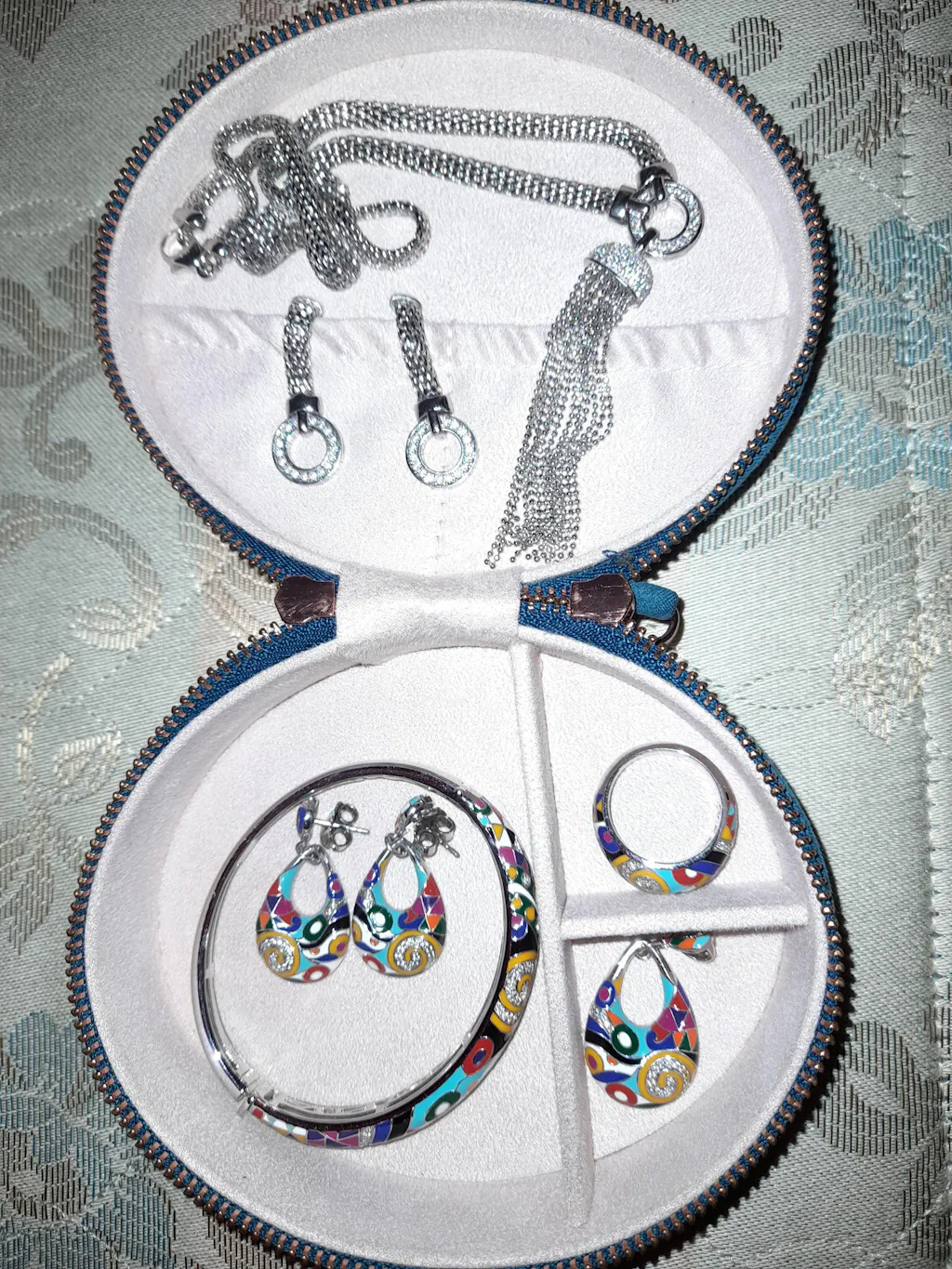 Confectionnée en suédine bleu canard, une matière de qualité élégante et douce au toucher, la petite boîte à bijoux de voyage se distingue par son intérieur opale lumineux et son design premium. Compacte, astucieuse et dotée d’une fermeture éclair robuste, cette petite boîte à bijoux de voyage garde et protège vos pièces d’exception à l’abri des chocs durant vos déplacements. Sa petite taille idéale et son format lui permettent de se glisser aisément. L'écrin à bijoux tient dans un grand sac à main ou un bagage cabine tout en offrant une capacité généreuse pour vos colliers, pendentifs, bracelets, bagues et boucles d’oreilles. La boîte est transportable. Pensée pour accompagner les femmes en quête de sophistication, cette petite boîte à bijoux de voyage allie esthétique, pratique et utile, fidèle à l’ADN d’Una Storia.